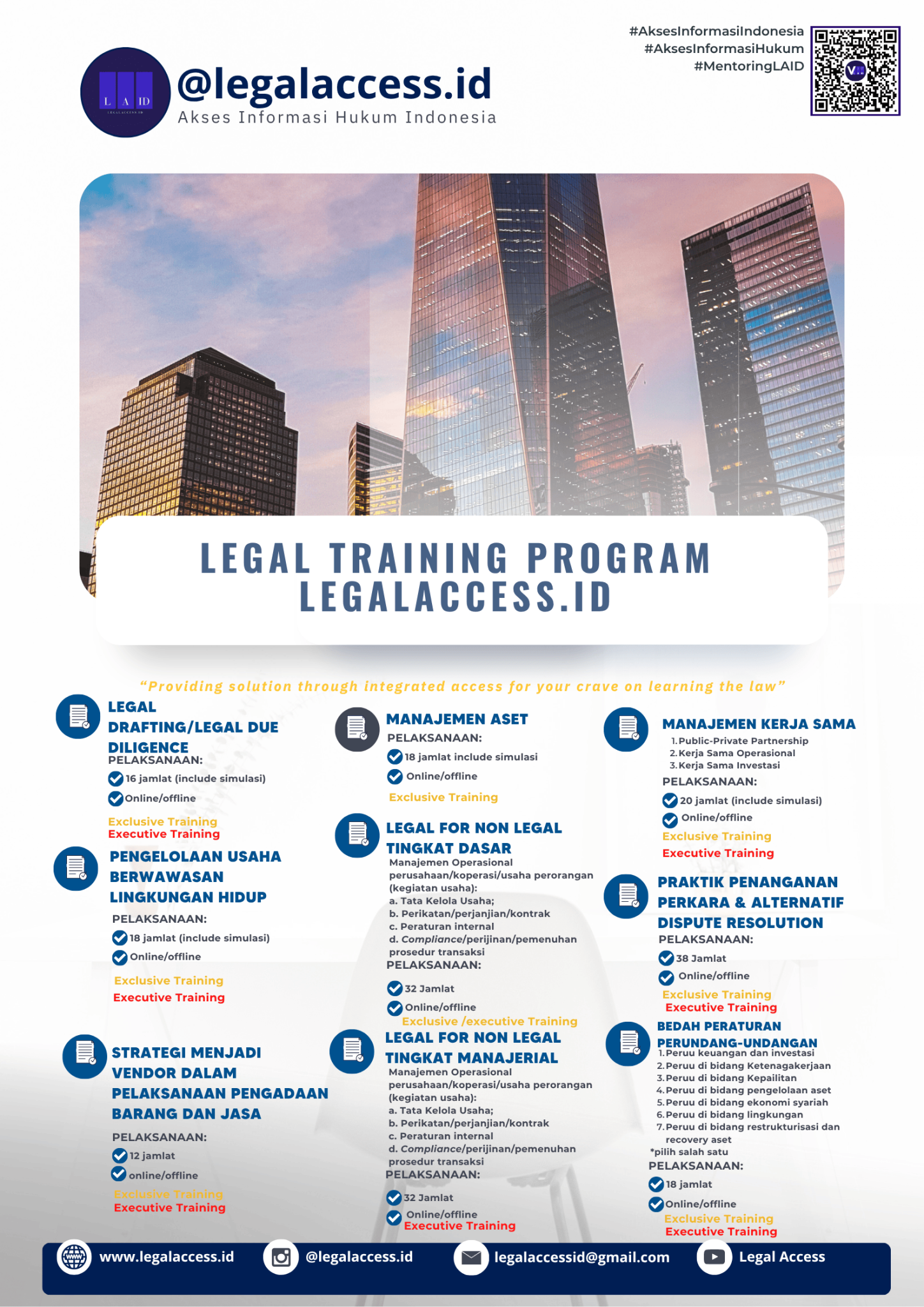 Legalaccess.id menyediakan jasa penyelenggaraan training hukum terbaik dan komprehensif. Kami memberikan standardisasi substansi materi yang dibutuhkan dalam penerapan proses bisnis peserta dan kebutuhannya. Kami membuat pilihan jenis training, yaitu exclusive dan executive training. Anda dapat memilih tingkatan basic-intermediate dalam program exclusive dan memilih tingkatan advanced dalam program executive.